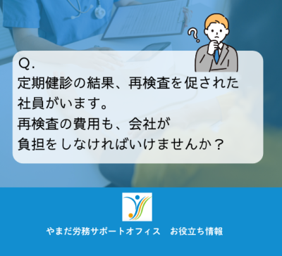 つまり、義務ではないので、再検査の費用は本人負担か事業主か補助するか、結果報告の取扱いなども含めて社内でルール化してください。